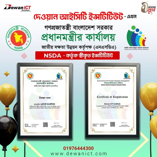 দেশের জনপ্রিয় আইটি প্রশিক্ষণ প্রতিষ্ঠান হিসেবে গণপ্রজাতন্ত্রী বাংলাদেশ সরকার, প্রধানমন্ত্রীর কার্যালয়, জাতীয় দক্ষতা উন্নয়ন কর্তৃপক্ষ (NSDA) থেকে নিবন্ধন সনদ পেলো দেওয়ান আইসিটি ইন্সটিটিউট।